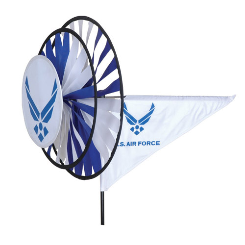 Air Force Triple Wheel Garden Yard Spinner by Premier. Made with the fade-resistant DuPont SolarMax fabric, our garden spinners will dazzle your home. Unlike other ordinary spinners made with nylon or polyester, ours can withstand daily UV rays, rain and snow. Each spinner comes with two heavy duty fiberglass poles and a ground stake. Plant one of these in your garden or deck for an exciting color blast.