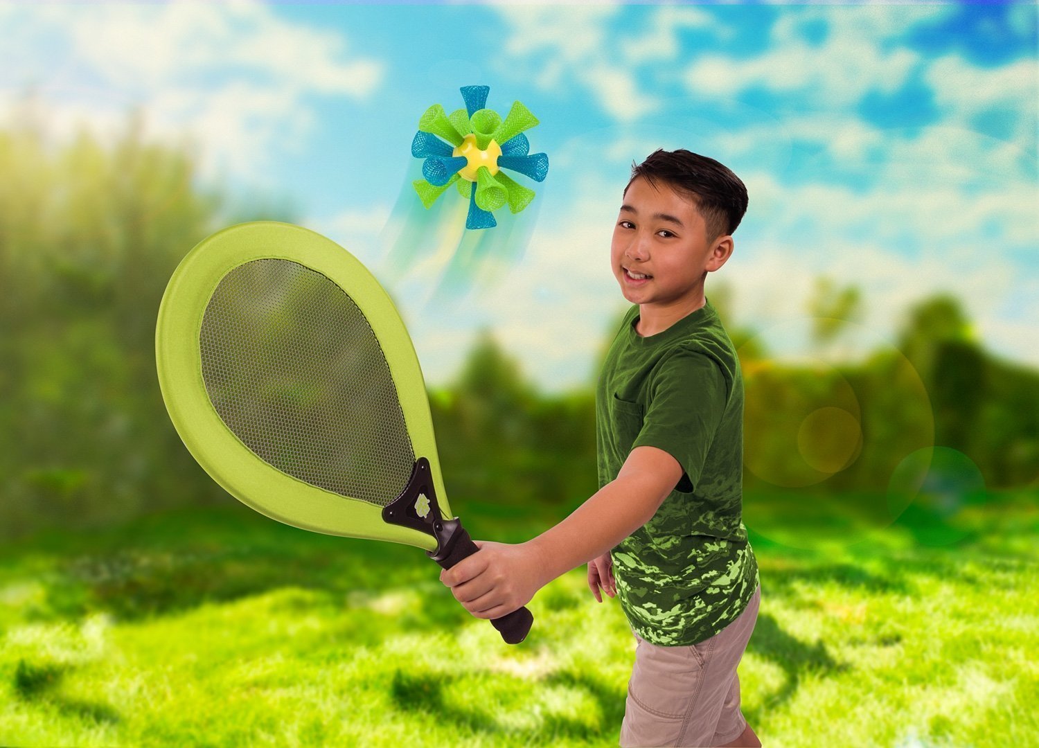 Volley back and forth with the oversized racket and bashable, birdie ball. A new oversized soft racket version of badminton. Enjoy hours of fun with your friends and family!