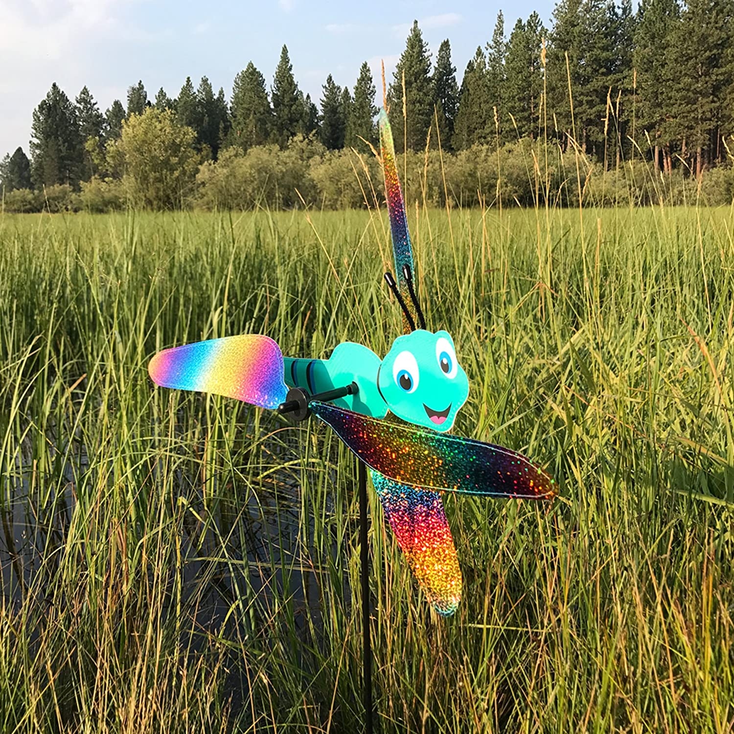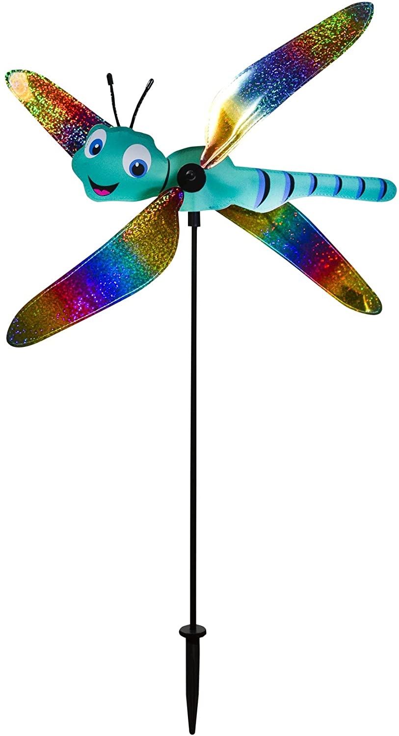 Dragonfly Yard Garden Whirligig Wind Spinner by In the Breeze. Baby Dragonfly whirligig. This cute and bright garden spinner is a fun way to add movement and color to your yard. This baby spinner measures 16 inches long by 29 inches high and is 7 inches deep. It’s the perfect size to go in flower pots or the garden! Made with durable weather and fade resistant fabric with detailed silk screen graphics, along with sparkly Mylar Wings. Ground stake included for easy placement with a sturdy fiberglass frame and pole. Easy assembly! Once put together the wings spin in opposite directions for a truly mesmerizing effect.