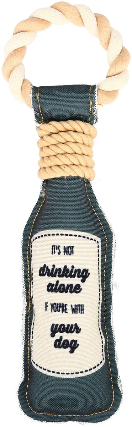 It’s not drinking alone if you’re with your dog PREMIUM QUALITY: 13″ beer/wine bottle-shaped dog pull toy, packaged in a plastic polybag, is made from 50% polyester and 50% cotton and features a jute rope handle. IN-HOUSE DESIGN: “It’s Not Drinking Alone If You’re With Your Dog” text is printed onto the front of the dog toy. PERFECT GIFT: Great for gifting to those who just got a puppy. CARE INSTRUCTIONS: Hand wash only with mild soap and water. This is a supervised pet play toy designed for you and your pet to enjoy together. Remove packaging before giving to your pet. Supervise your pet while playing. Contains small parts that may pose a choking hazard. This is not a child’s toy.