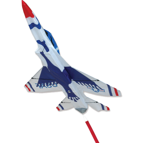 F-16 Thunderbird Jet Kite by Premier Kites. Premier’s Jets take to the skies with realistic shapes and markings. Easy to fly with long 20 foot streamer tails, these kites look like the real thing in the air. All Jets come with two suspension loops so they are easy to hang at any angle in a room for display.