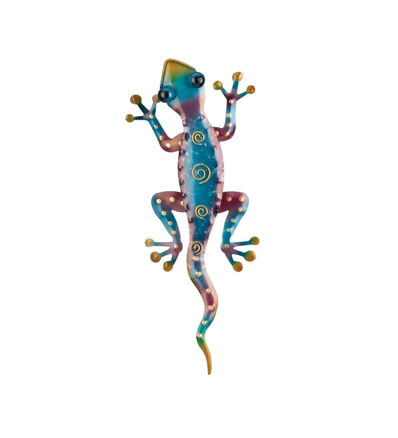 Gecko Decoration 11″ – Rainbow Purple. Delight any wall with this playful gecko. Beautiful rainbow hues show off the intricate detail of the metal. Weather resistant and can be enjoyed indoors or outdoors. Combine other colors and different sized gecko decoration pieces for added appeal.