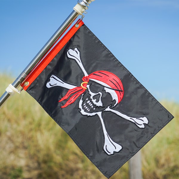 This fun and bold Jolly Roger grommet flag is great for party atmosphere or year-round decor. The two-layered, applique construction allows for the Jolly Roger to appear identical on both sides of the flag.
