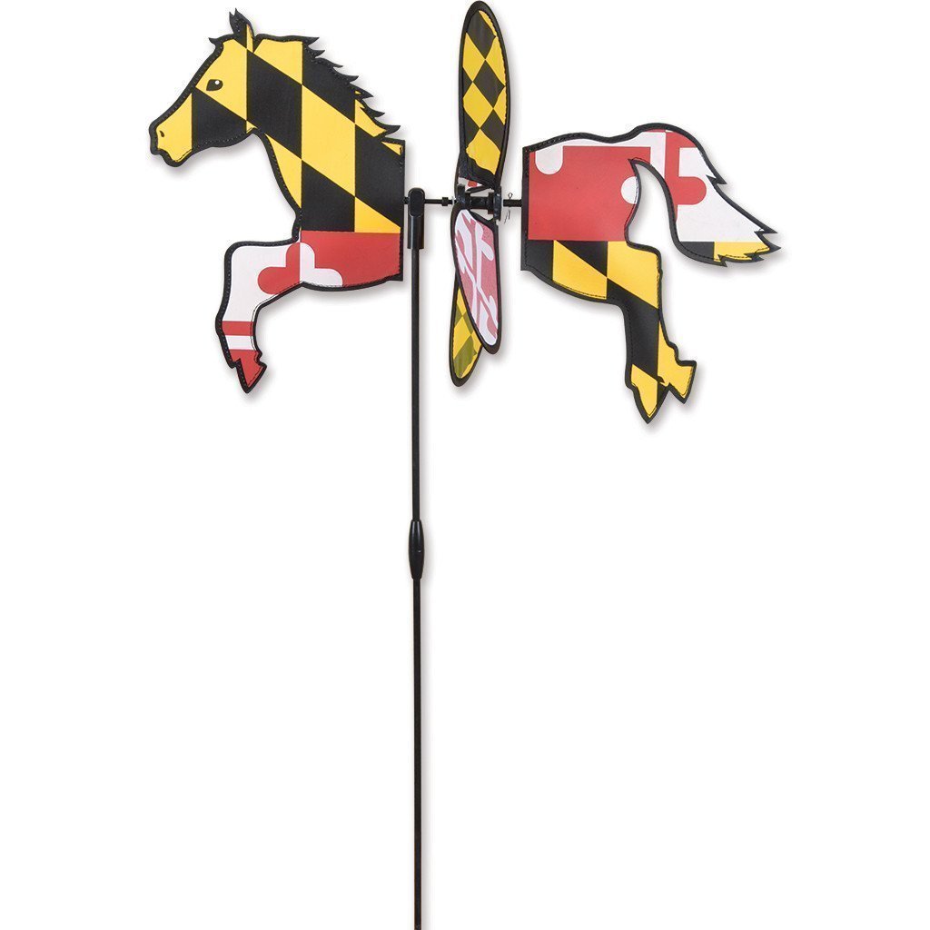 Show your Maryland pride! The Petite Maryland Horse Wind Spinner, by Premier Designs is made with durable and fade-resistant fabric. Uses heavy-duty hardware to ensure your Petite Maryland Horse Wind Spinner will be spinning for many days to come. The Petite Maryland Horse Wind Spinner vanes in light winds and the unique, spinner-tails create a beautiful visual display. The Petite Maryland Horse Wind spinner makes a fun and playful addition to your lawn or patio this summer and makes a great gift idea in any season. It measures 16 x 12.75 x 12.75″.