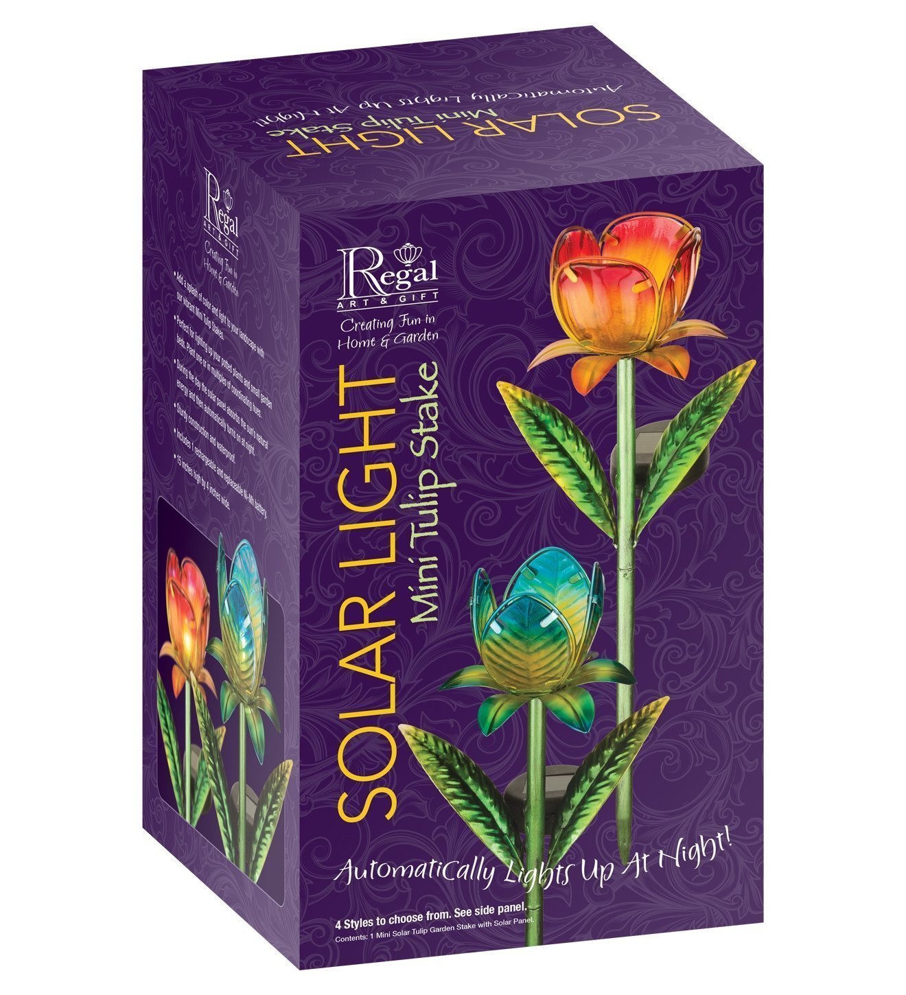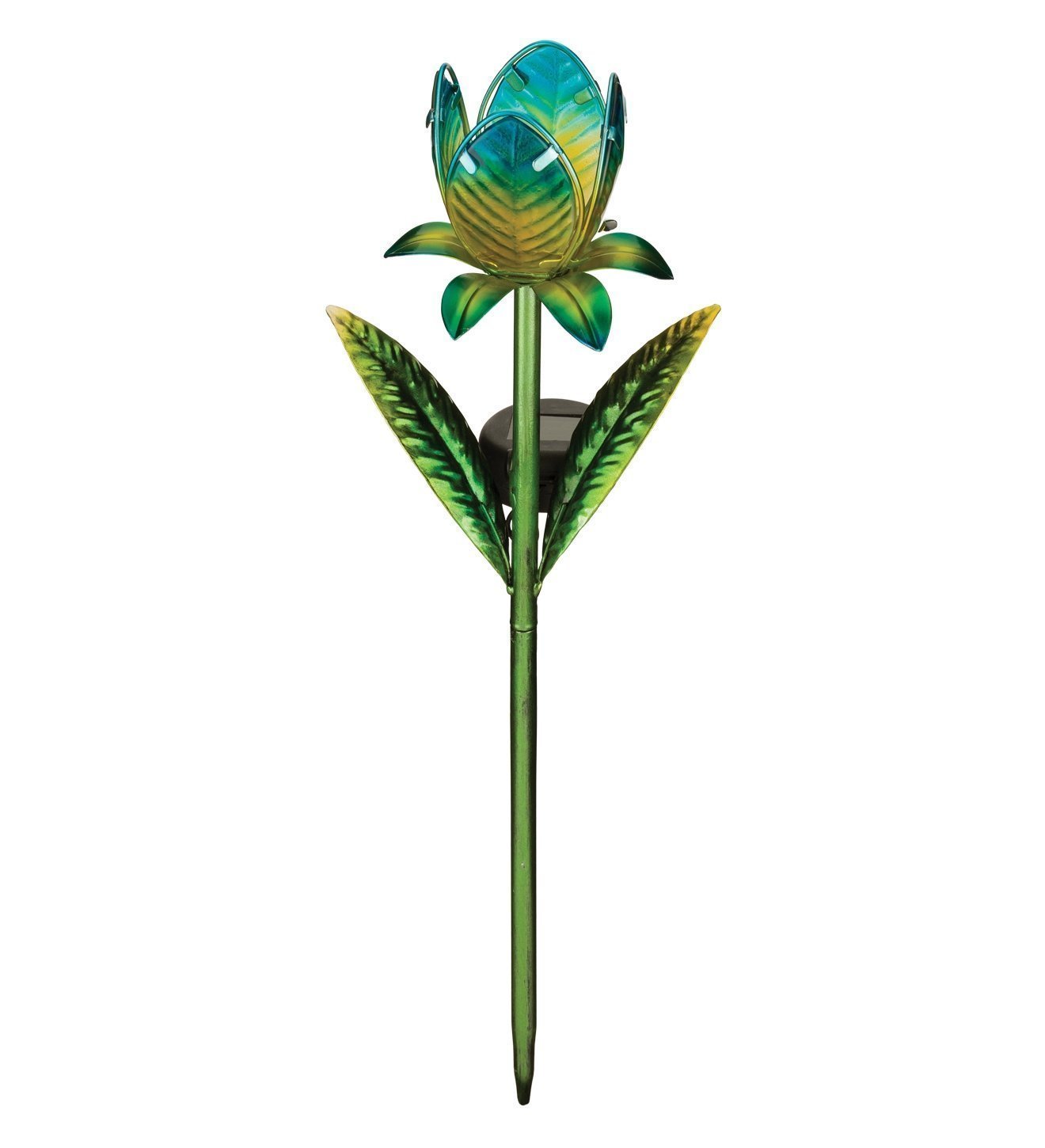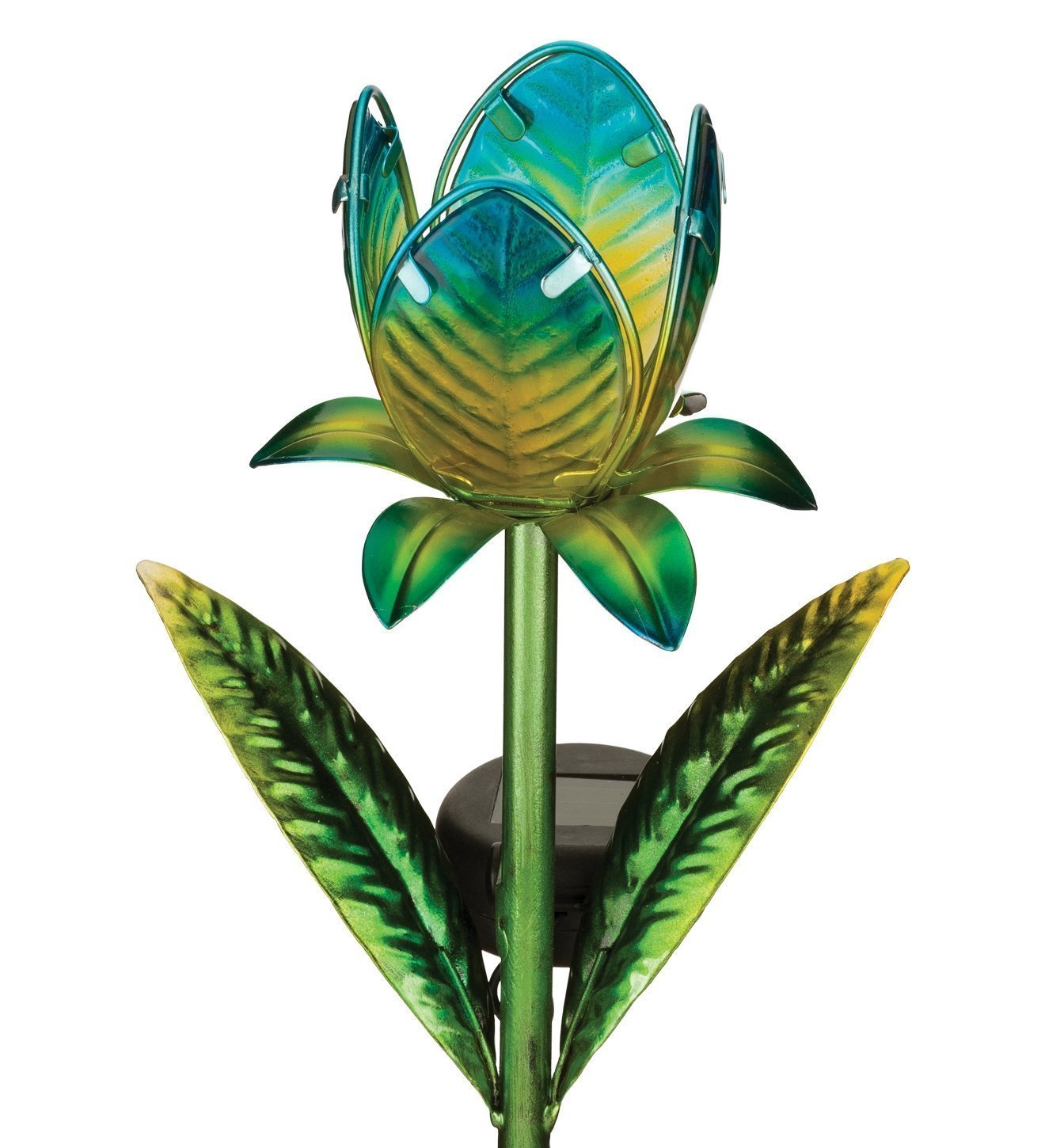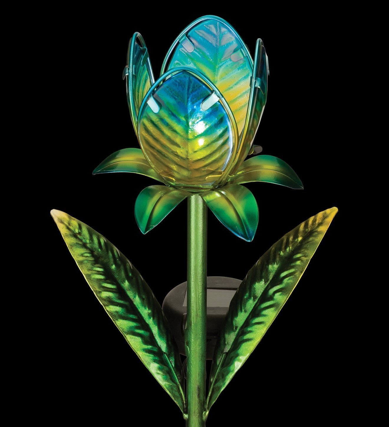 This 15″ mini tulip solar stake features an iridescent metal finish and hand-painted glass petals.