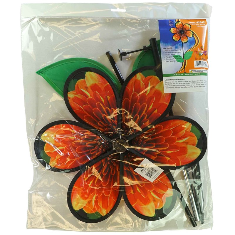 The 13.5″ Mum Spinner with Leaves features six petals with a realistic printed chrysanthemum design and two green leaves attached to the fiberglass stem. The vibrant petals create a charming flower that will please onlookers as the spinner rotates easily in the breeze.