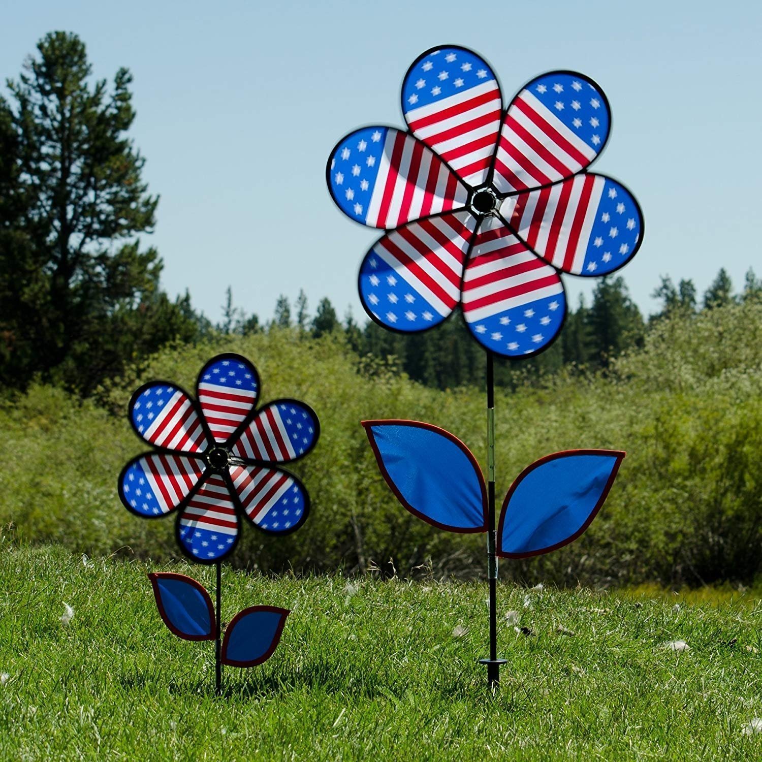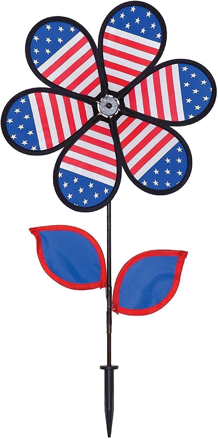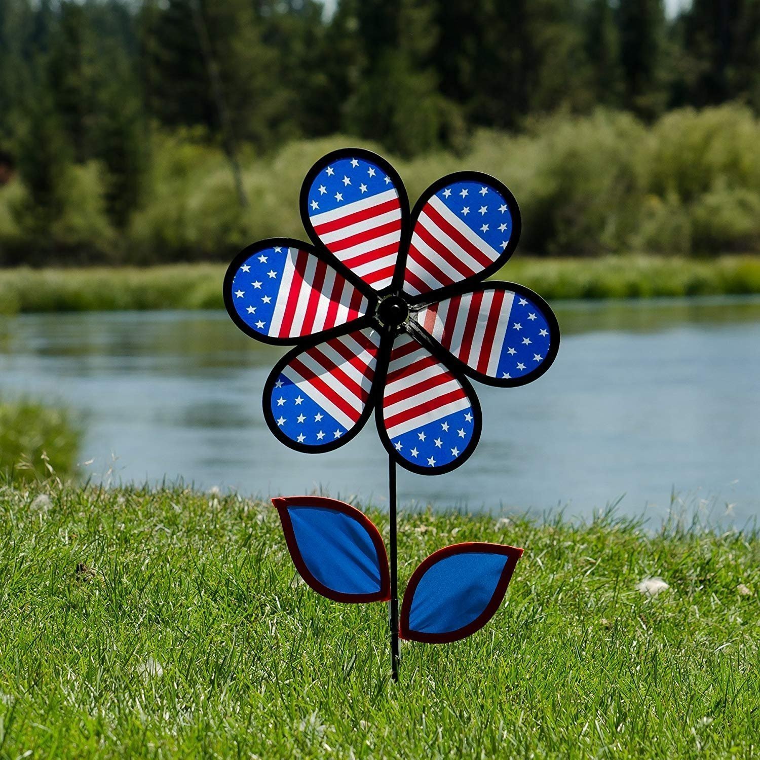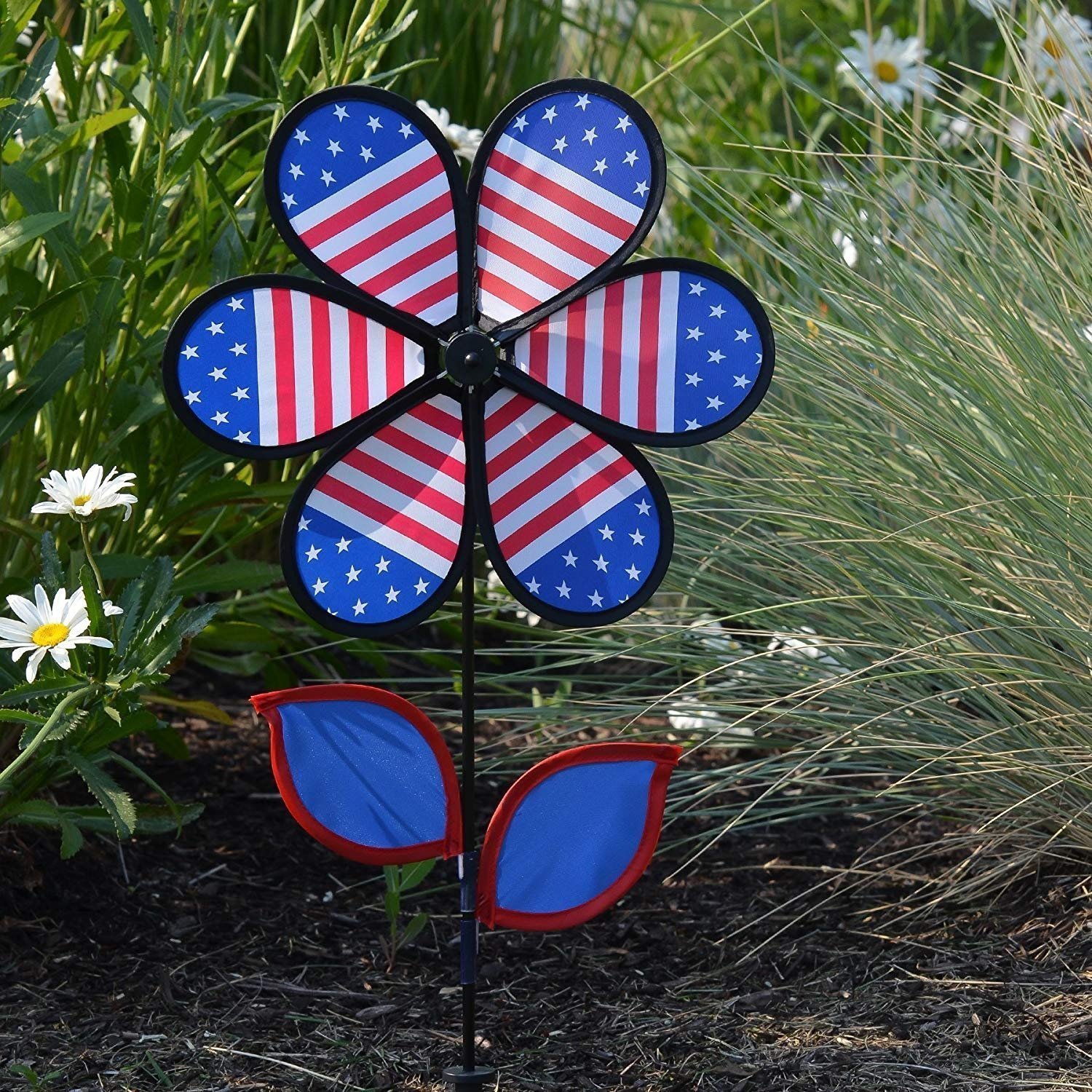 Decorate your yard or garden with this patriotic flower! Comes with a fiberglass pole and ground stake. Minimal assembly is required. Simply put the assembled 6 petal flower wheel on the horizontal rod-then secure with rubber end cap. We recommend in high wind areas that you use high-strength glue in the end cap – glue is not included. This will prevent the petal wheel from being pushed off from excessive wind coming from the back. Your garden will come alive with kinetic color. Garden flower spinners mesmerize as you watch them spin.