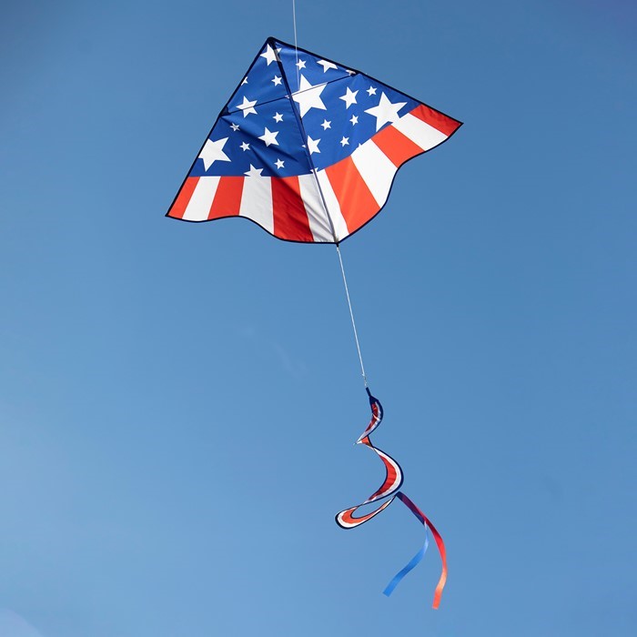 This unique Patriotic Star Delta Kite is super easy to fly and looks great in the sky! With its large 46″ wingspan, it’s sure to catch attention. A 42″ detachable, matching curlie spinner flows behind the rounded back of the delta body. This versatile and patriotic kite is one the whole family can enjoy!