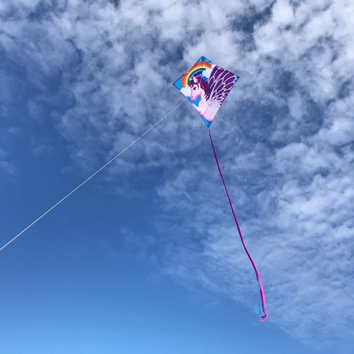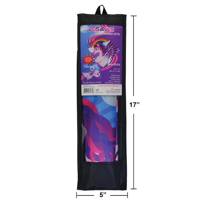 This kite is awesome for your next outdoor adventure! Each kite is made of Lightweight, durable ripstop fabric with fiberglass rods, and a detailed printed design, that looks great when flying. Now packed in short optimized packaging! This will fold out into a full sized kite, and with some easy spar assembly, you’ll be flying. Comes complete with kite line on a handle winder and a reusable kite bag. Very easy assembly. This mythical winged horse is perfectly at home in the sky! Perfect for vacations and airplane traveling.