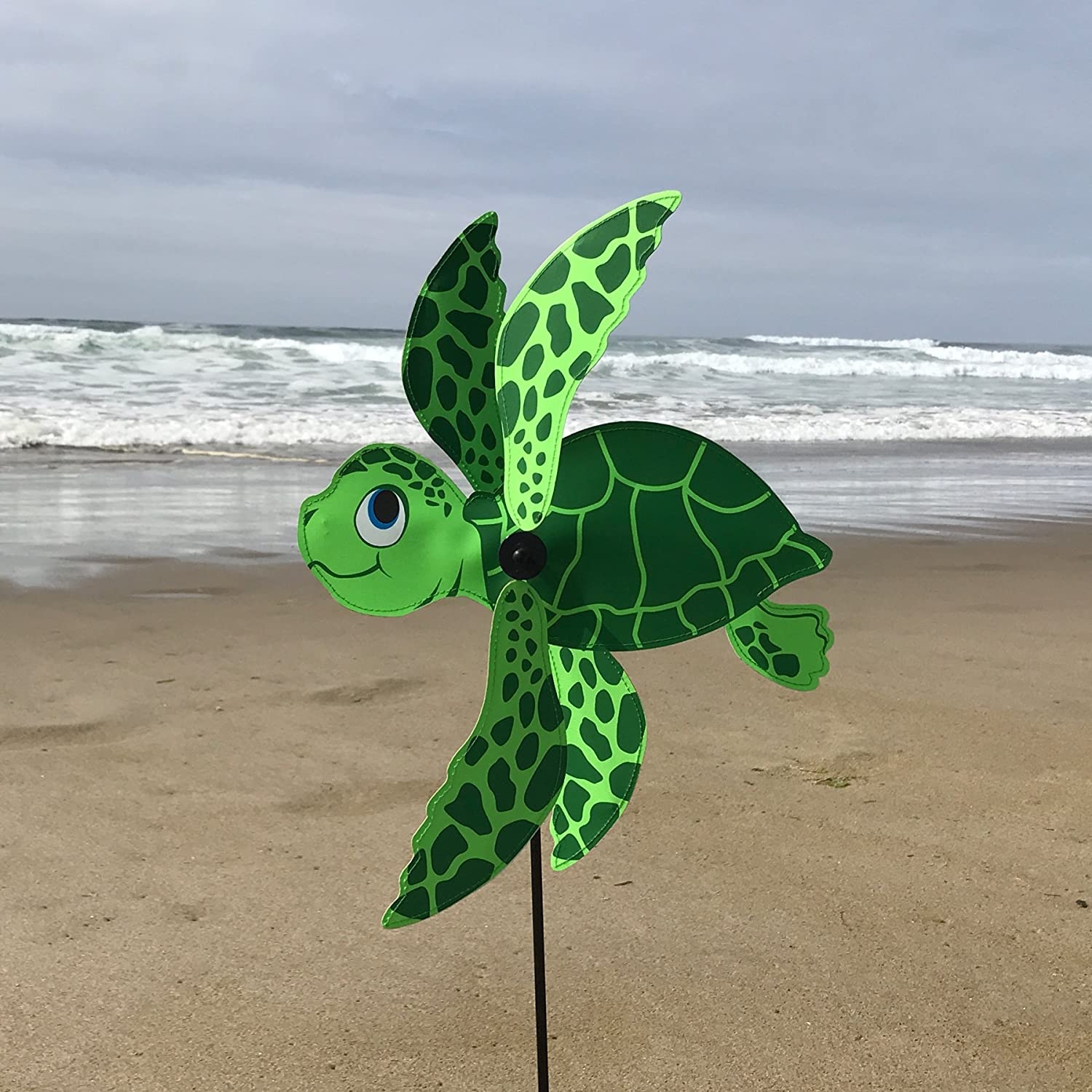 Baby Sea Turtle Whirligig. This CUTE AND BRIGHT garden spinner is a fun way to add movement and color to your yard. This baby spinner measures 16 inches long by 29 inches high and is 7 inches deep. It’s the PERFECT SIZE to go in flower pots or the garden! Made with DURABLE WEATHER AND FADE RESISTANT fabric with detailed silk screen graphics. Ground stake included for EASY PLACEMENT with a sturdy fiberglass frame and pole. EASY ASSEMBLY! Once put together the flippers spin in opposite directions for a truly mesmerizing effect.