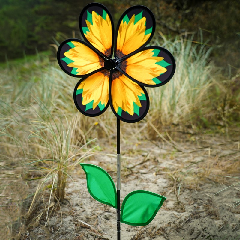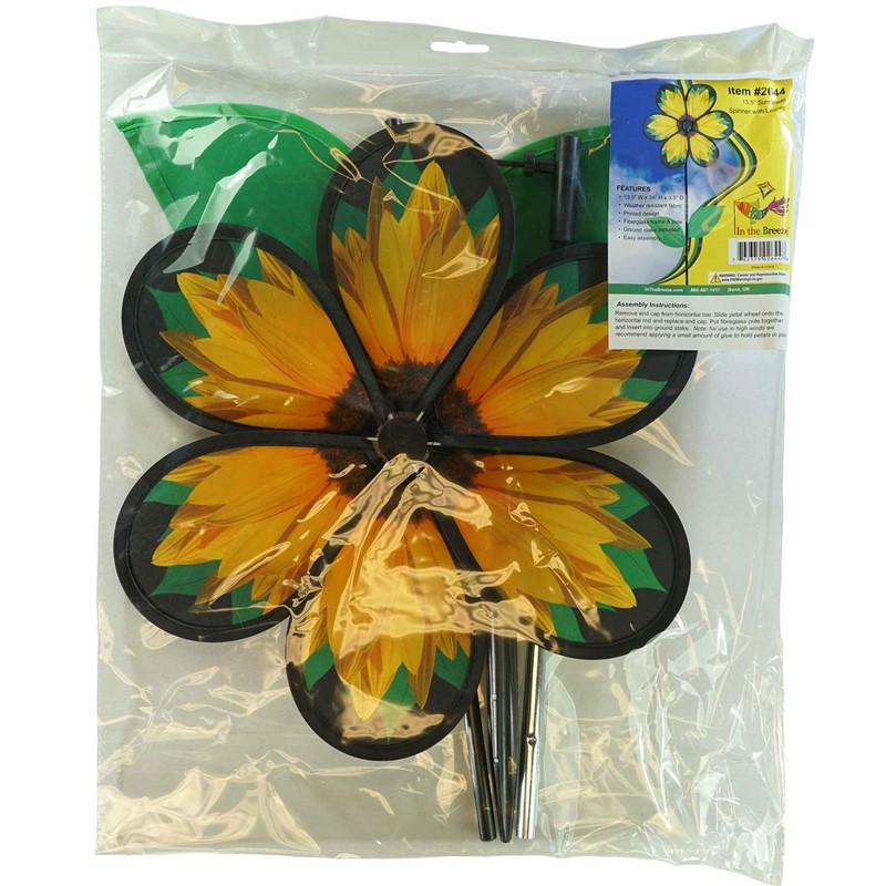 The 13.5″ Sunflower Spinner with Leaves features six petals with a realistic printed sunflower design and two green leaves attached to the fiberglass stem. The vibrant petals create a charming flower that will please onlookers as the spinner rotates easily in the breeze.