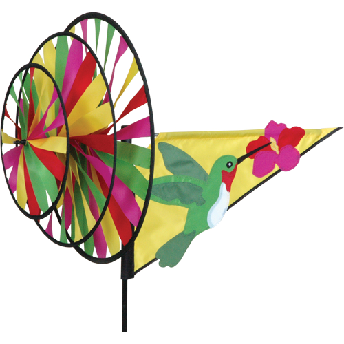 Hummingbird Triple Wheel Spinner by Premier are made with weather and fade resistant polyester. The fabric edges have been heat sealed which will help them look sharp as they spin round. The pivoting pole and wind sail will keep the three spinner wheels facing the wind.