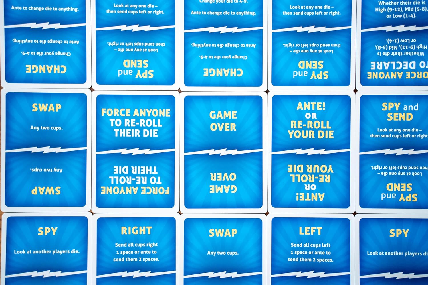 - HOW TO PLAY: Each player shakes their cup with d12, peeking at the die value. Play starts with drawing a card from the pile – the player can take the action on the card (Spy, Swap, Re-roll, Reveal) or choose to flip the High/Low token. Play continues around the table until the end round card appears from the draw pile – the player with either the highest or lowest dice value (based on the token) wins the round!